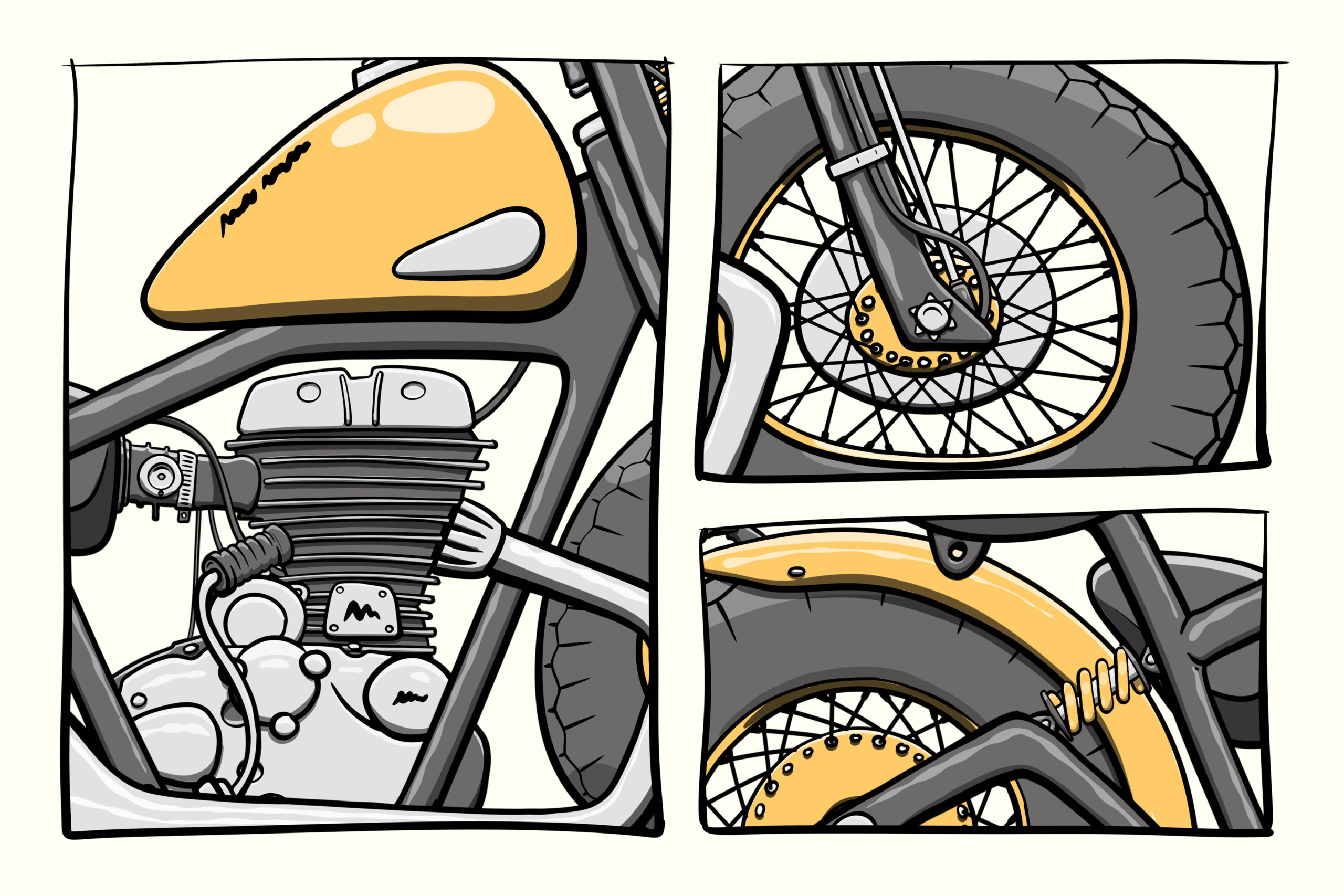 You get a hi-res Photoshop file (6400 x 4800 pixels @ 300 dpi) that contains one motorcycle. All parts are kept in separate layer groups: the front, seat, tank, exhaust, frame, fenders, wheels and engine. Then each part has separate layers for lines, color, highlights and shades.